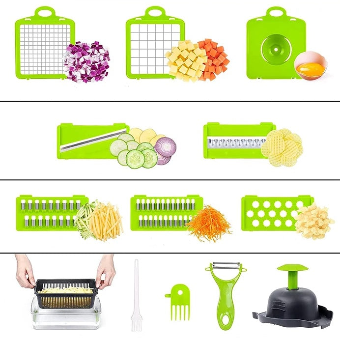 Coupe-légumes multifonction 16 en 1 avec 7 lames interchangeables, récipient de 1,2 litre, facile à nettoyer, sécurisé par une base antidérapante et des protège-mains, matériaux de qualité sans BPA. La livraison est offerte !