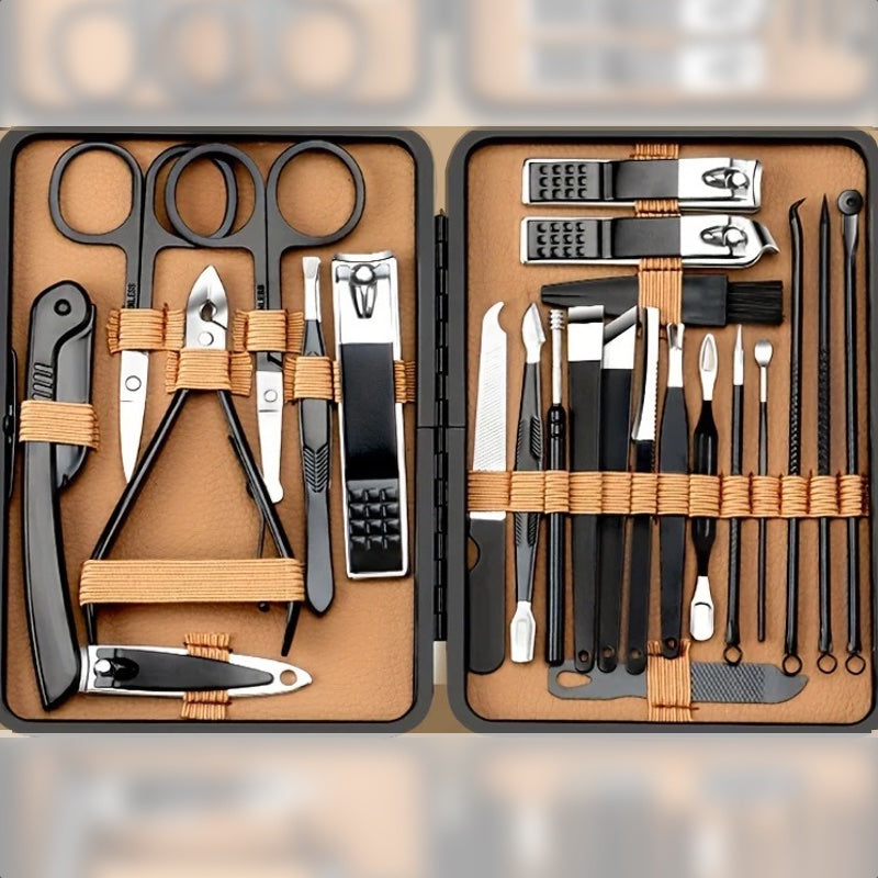 Complet et polyvalent : coupe-ongles (petit, moyen, grand et diagonal), ciseaux, pinces, lime, cure-cuticules, outils de pédicure et accessoires de soins.