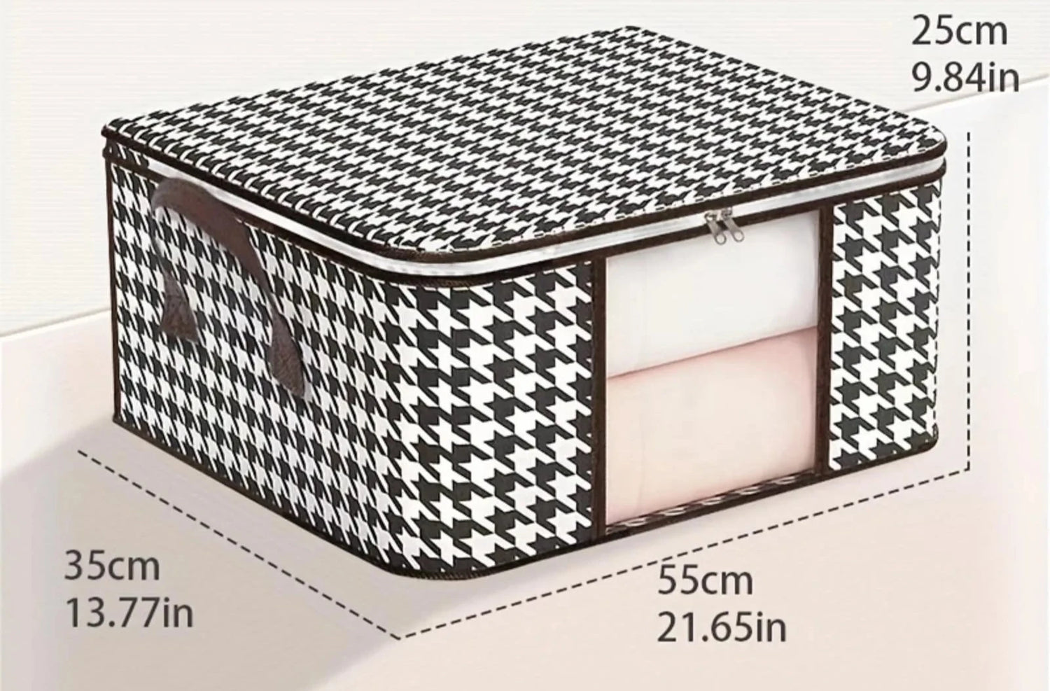 Parfait pour chaque espace : placard, vestiaire, grenier, chambre ou dortoir universitaire. Cette housse de rangement au motif pied-de-poule élégant allie style et praticité pour une maison bien organisée.