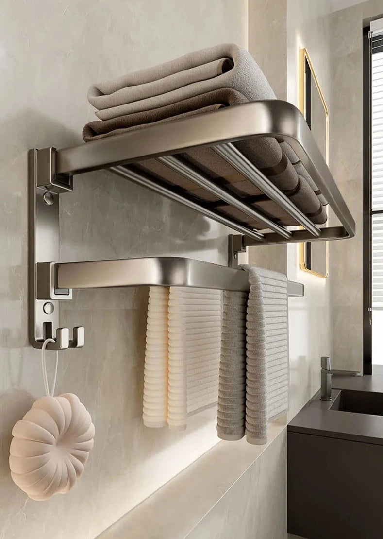 Porte-serviettes mural pliable en acier inoxydable avec barres et crochets, installation adhésive ou par perçage, idéal pour salles de bain et cuisines. La livraison prioritaire est offerte !